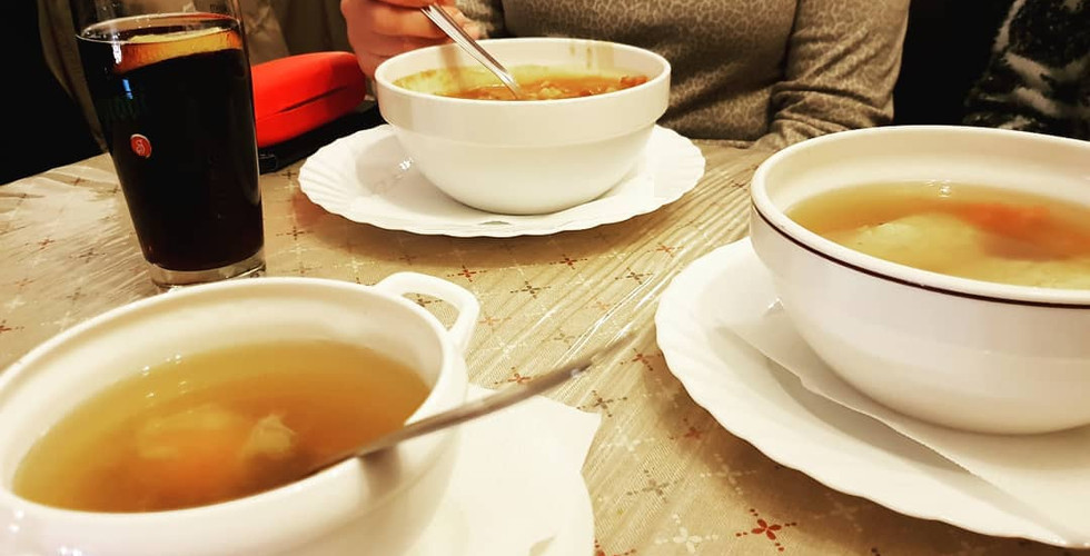 Después volvimos a caminar sin un rumbo fijo hasta que la lluvia lo permitió y entramos en el primer restaurante que vimos, el Tulipán. Ya iba avisado de cómo son las comidas en Hungría: de primero, un Goulash siempre, que no es lo mismo que aquí... allí llaman Goulash a lo que nosotros llamaríamos sopa con tropezones, que puede ser de cualquier cosa: pescado, carne, pollo, setas, verduras, frutas…. De segundo, un plato carnívoro, con guarnición y postre.