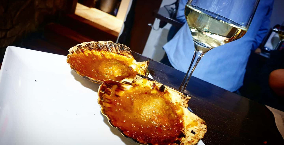 Aún quedaba lo más importante de la noche: la cena. Aunque estábamos llenos, había que hacer un esfuerzo. Fuimos al restaurante María Castaña, en el centro de Santiago y según vimos la carta supimos lo que queríamos: Polbo y Raya. Era nuestra noche. Pero no penséis mal, Polbo es pulpo y Raya es pez Raya, que nunca lo habíamos probado, y por si nos quedábamos con hambre... ¡mejillones en salsa de erizo!