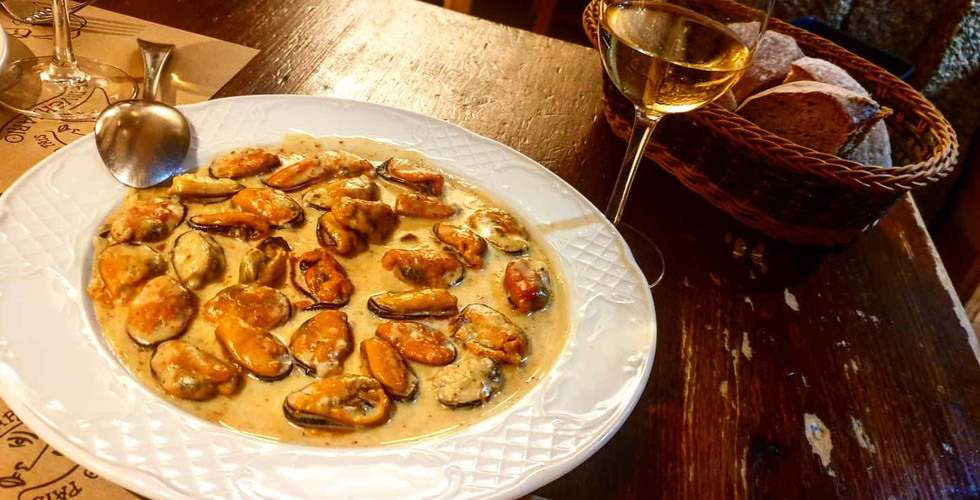 Ya en la parte norte, más urbana, lo que buscamos fue un lugar donde comer, porque ya era tarde y algo habría que comer. Mine estaba de antojo de ostras, así que entramos en As Pías, que ponía que había ostras en la mariscada. Sin darnos cuenta que estábamos en Galicia, de nuevo pedimos la mariscada, sin mirar. Y, claro, allí no paraban de salir platos: nécoras, camarones, cigalas, ostras, vieiras, zamburiñas, navajas, pulpo, berberechos y mejillones, casi nada... y todavía nos dicen que si nos hemos quedado con hambre.